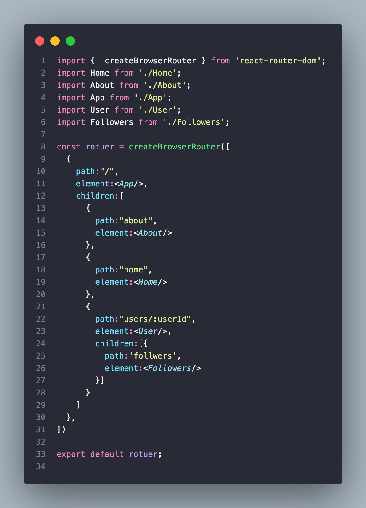users/:userId 를 params 로 갖고와서 <User/> 컴포넌트를 렌더링 시켜주고 children로는 <Follwers/> 를 컴포넌트를 렌더링 시켜준다.