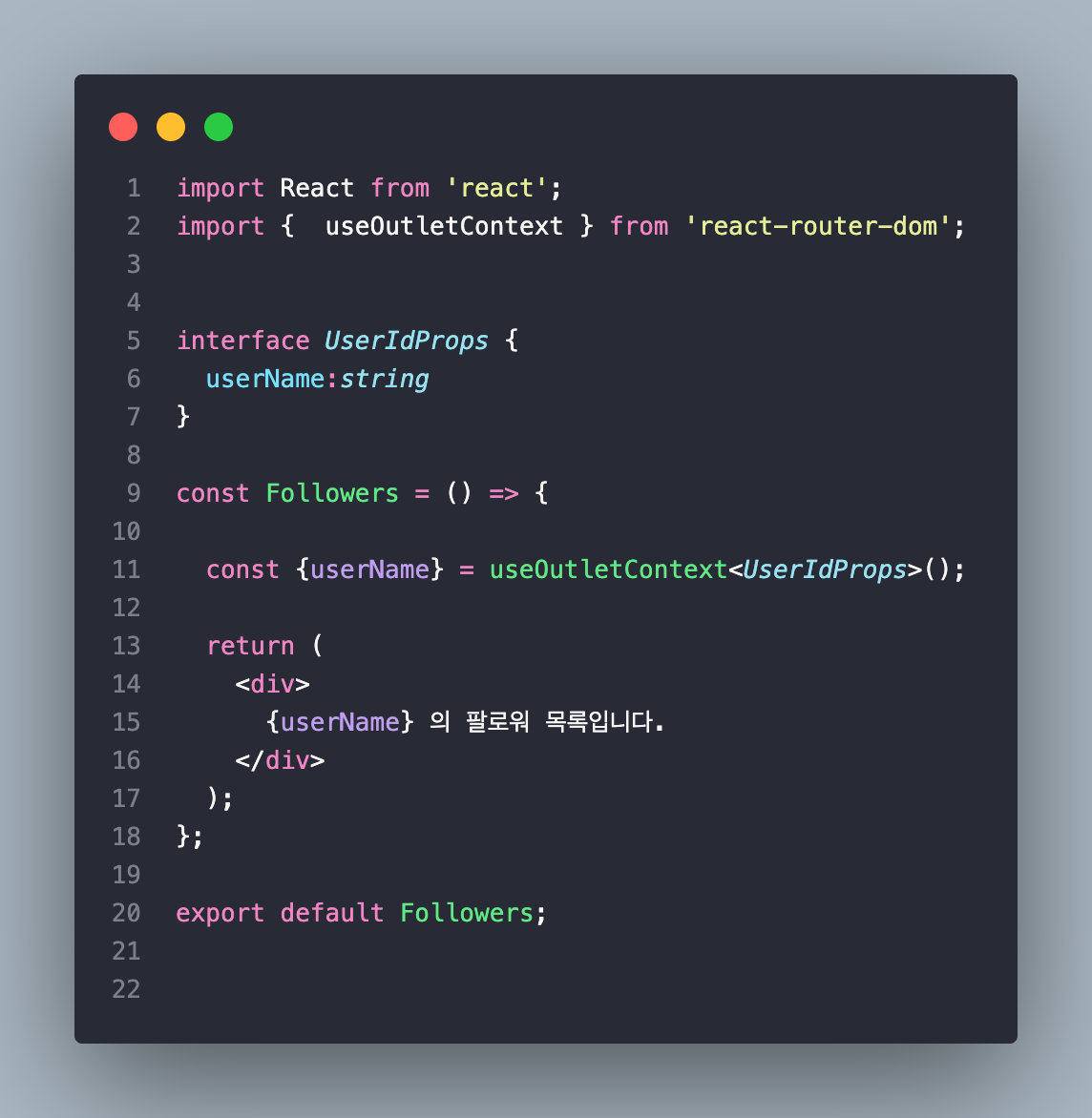 Follwers.tsx context로 전달된 userName 을 useOutletContext 함수로 갖고와줘서 그대로 화면에 뿌려주기만 하면된다.
