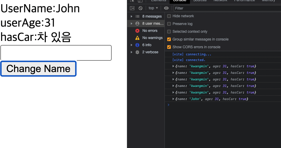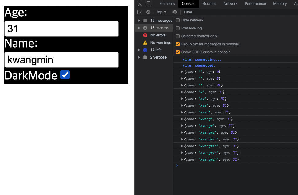 age,name을 input 으로 업데이트 할때마다 콘솔창에 잘 출력되는것을 볼 수 있습니다.