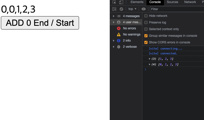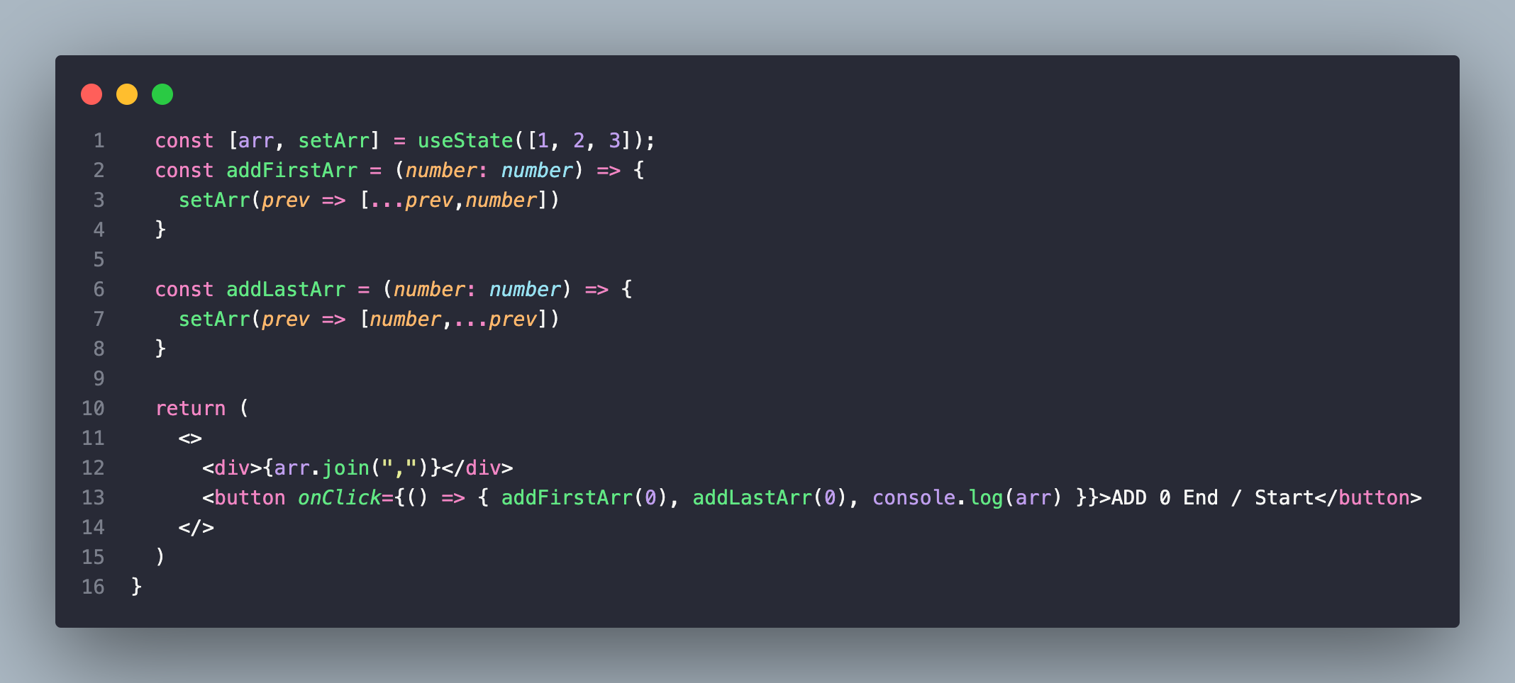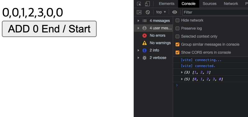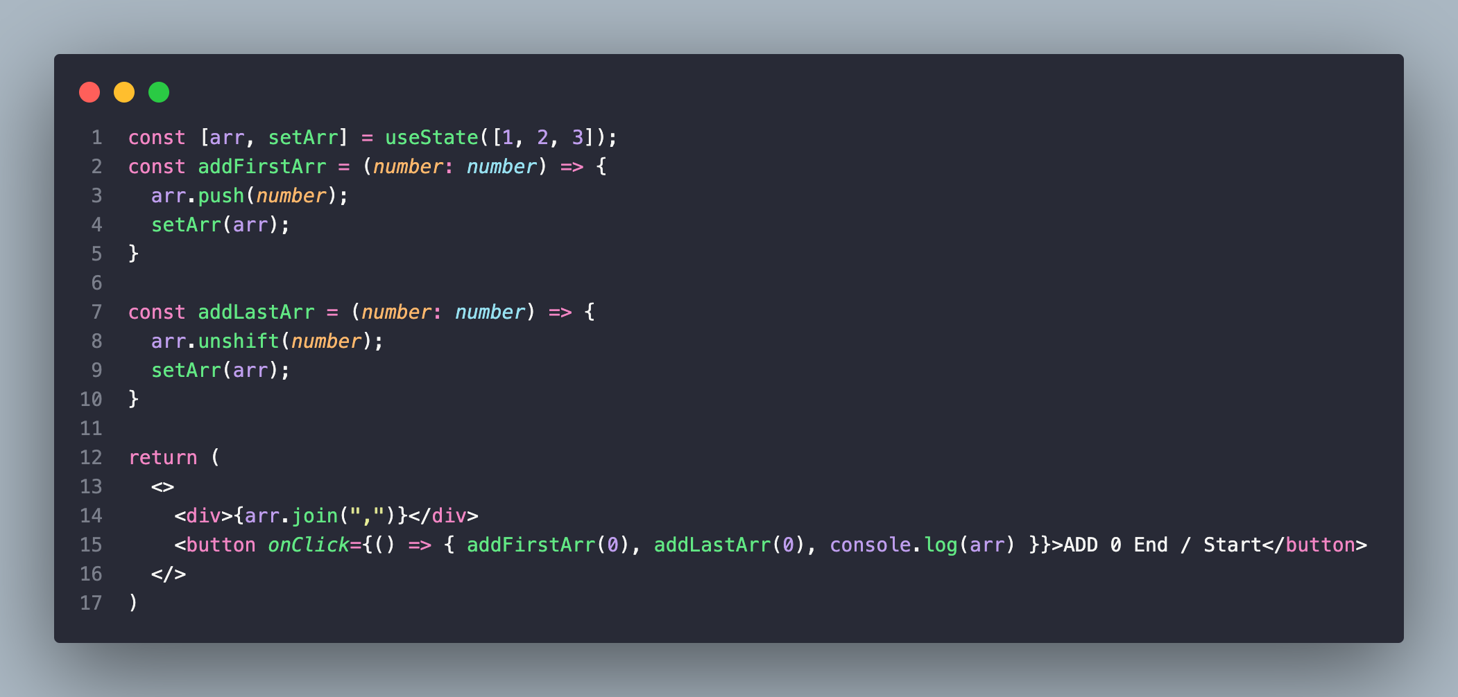 아래의 코드는 버튼을 누르면 각 arr의 시작과 끝 부분에 push , unshifit 를 이용해 숫자 0을 추가 해주는 간단한 예제입니다.