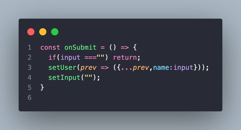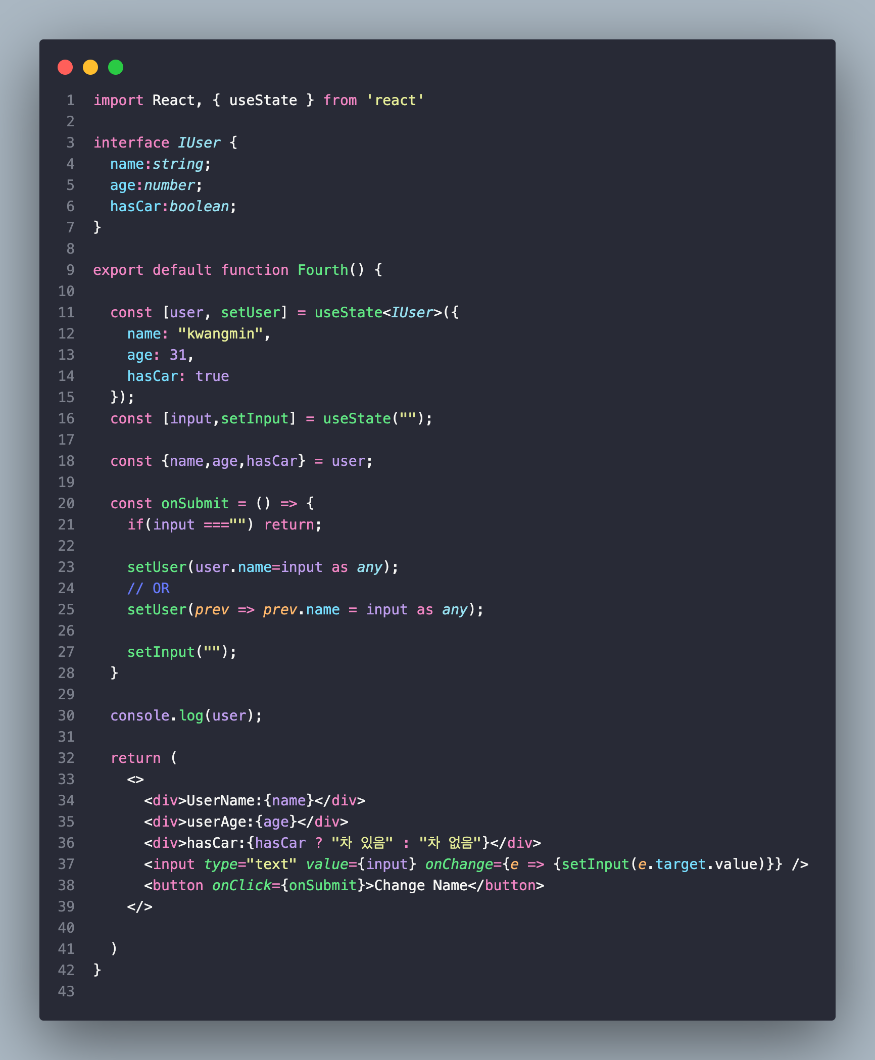 여기서 위 코드처럼 setUser 을 통해 user name을 바꾸면 객체가 아닌 string이 반환 되면서 원하는 결과를 얻지못합니다.
