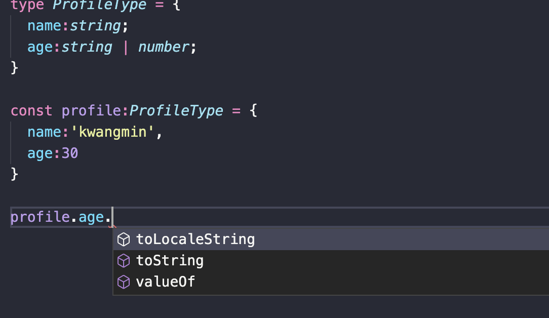 type ProfileType = { name:string; age:string | number; } const profile:ProfileType = { name:'kwangmin', age:30 }