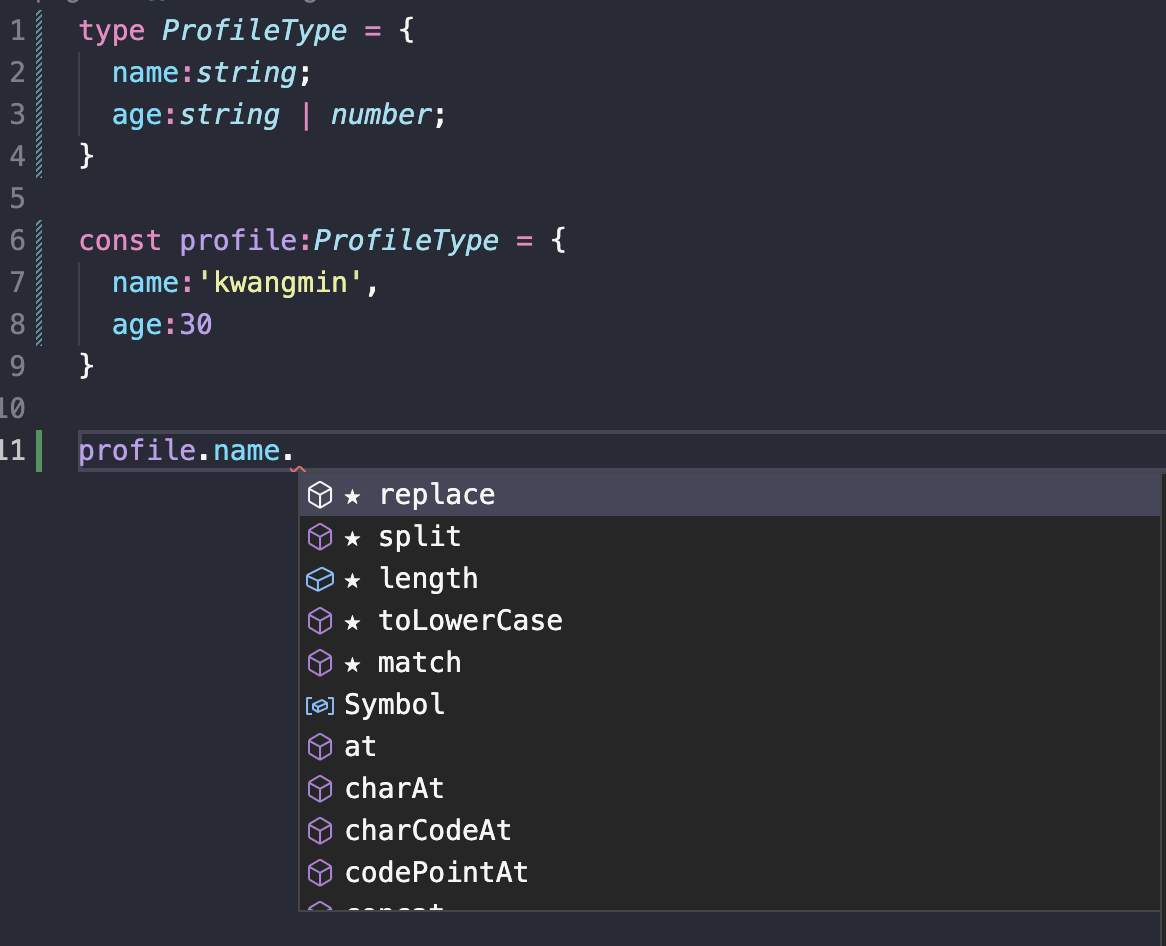 그래서 profile 객체의 name의 키값에 접근할때는 string method를 자동완성으로 보여주고있습니다.